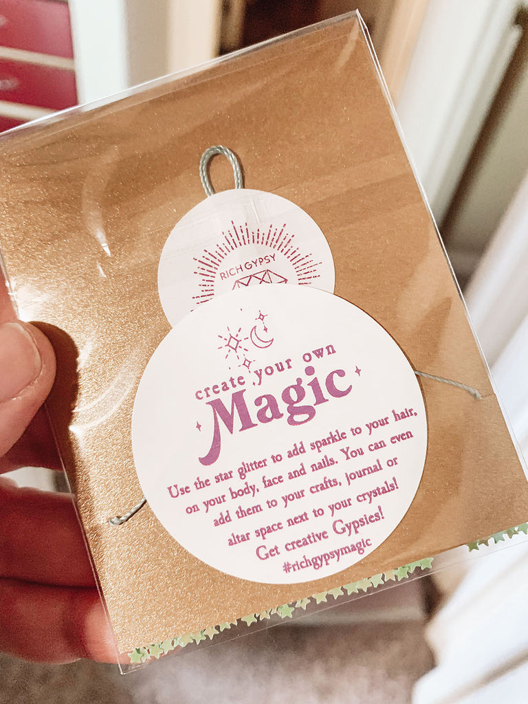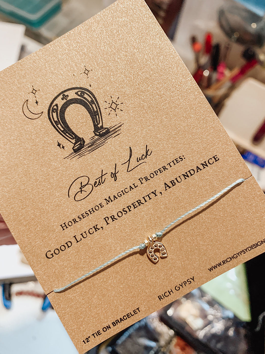 This tiny horseshoe charm cord bracelet comes carded and packaged ready to display! They make the perfect grab-and-go gift, a great stocking stuffer, and even a fun friendship bracelet! All bracelet cards were printed on shimmering gold paper and packaged with sparkling star confetti for a bit of magic to get creative with!