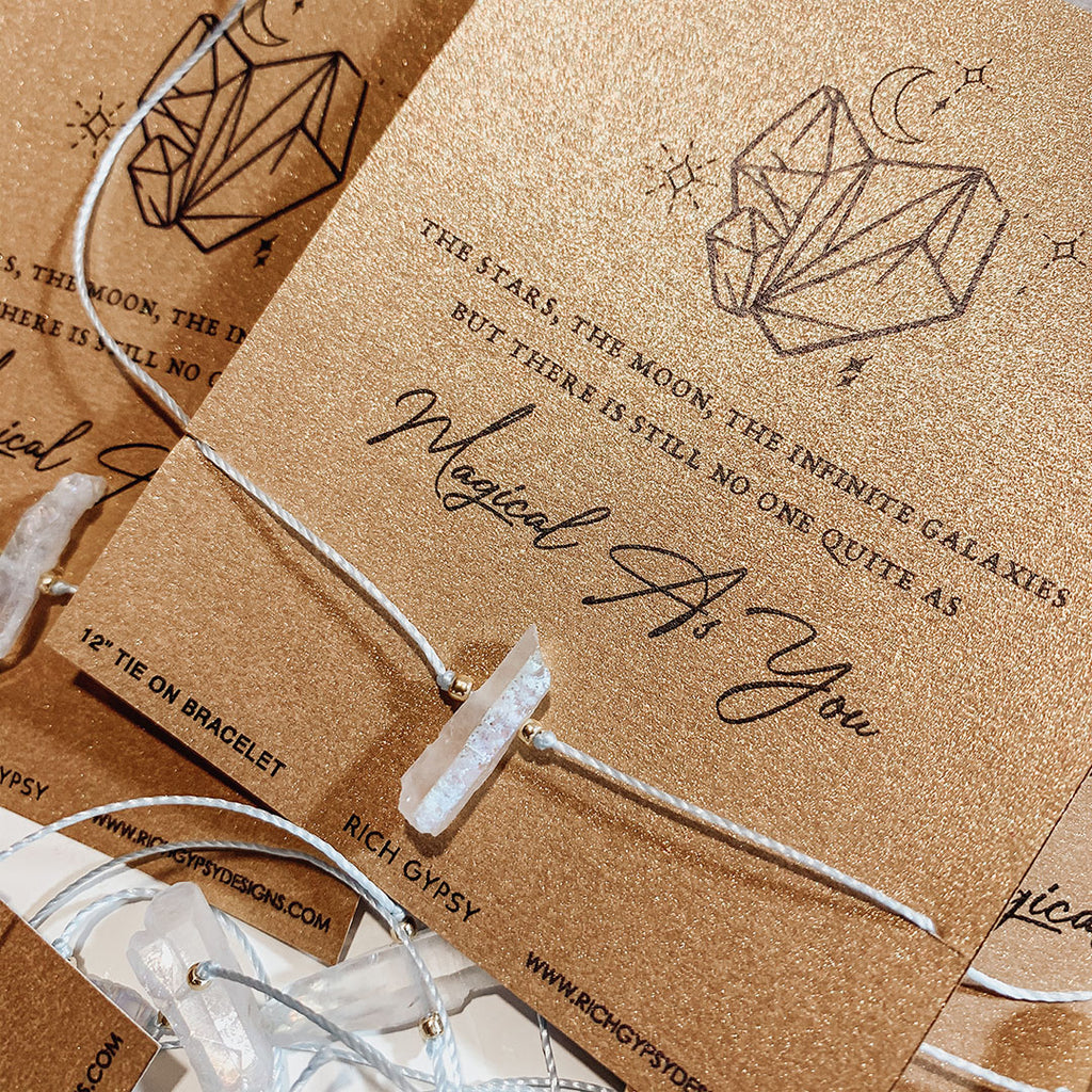 This Quartz Crystal cord bracelet comes carded and packaged ready to display! They make the perfect grab-and-go gift, a great stocking stuffer, and even a fun friendship bracelet! All bracelet cards were printed on shimmering gold paper and packaged with sparkling star confetti for a bit of magic to get creative with!