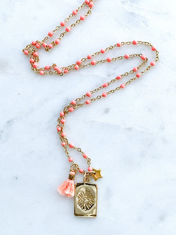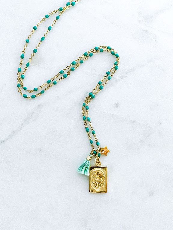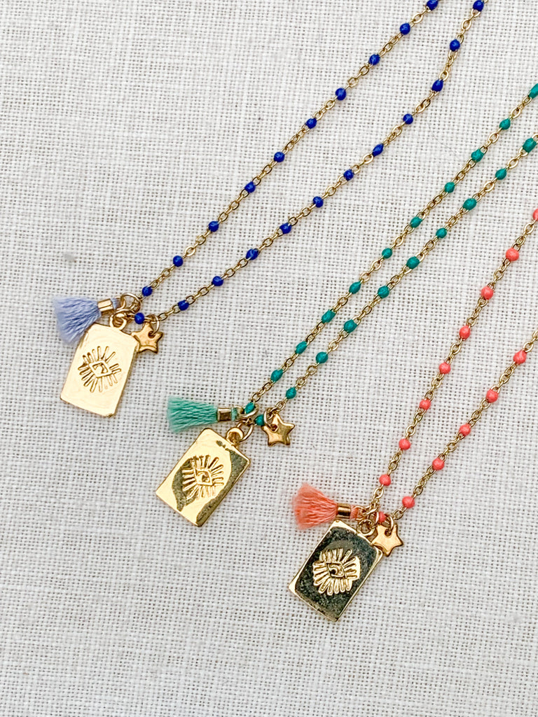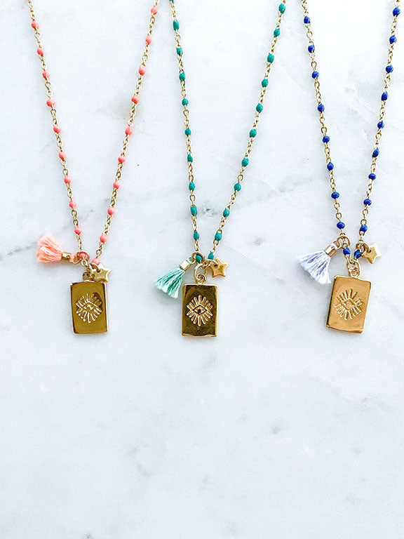 This evil eye charm necklace features a gold-plated evil eye tag charm for protection, a stainless steel star charm, and a tiny cotton tassel.