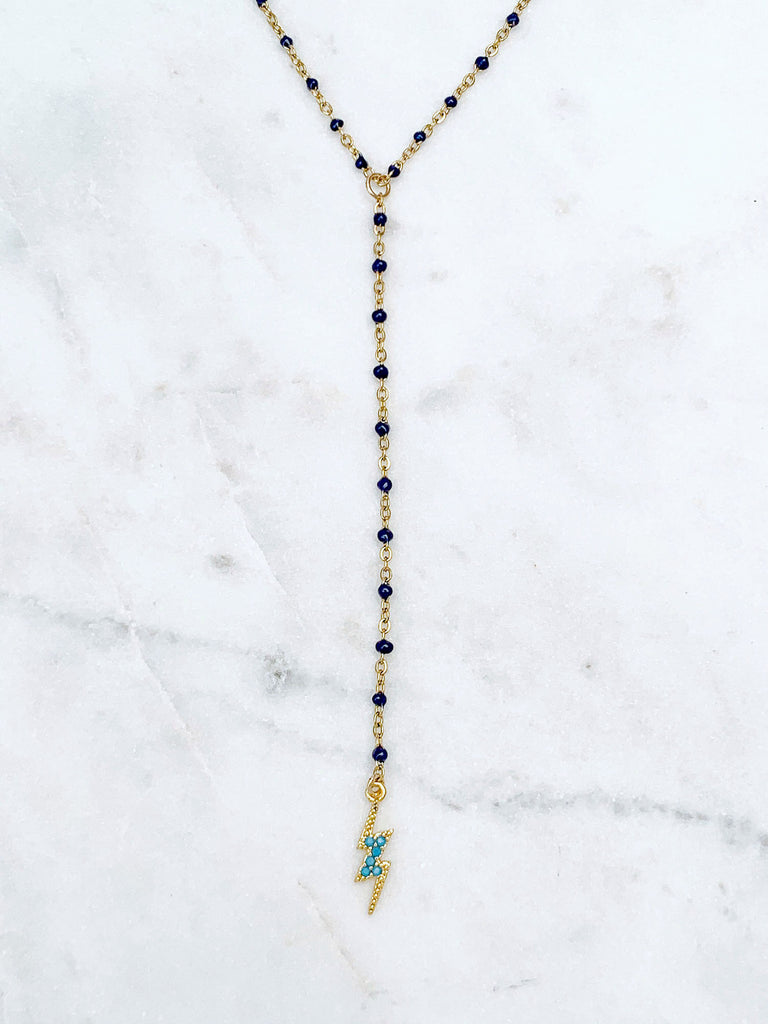 A pop of Navy Blue "Y" Style necklace with a lightning bolt charm is a favorite!