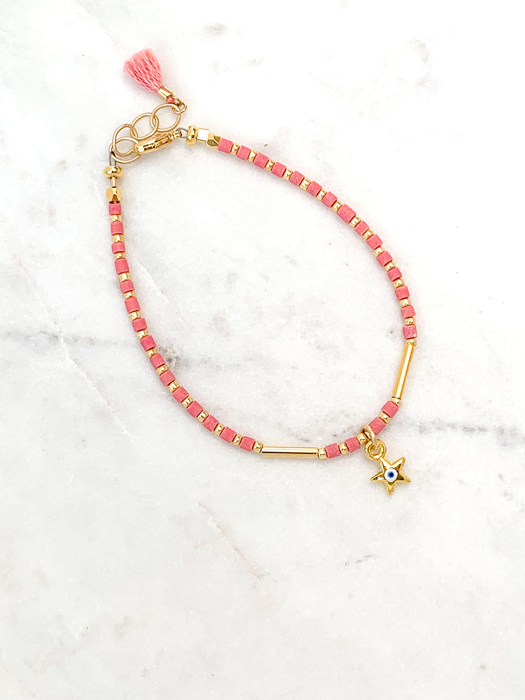 This beaded charm bracelet features an evil eye star charm and the prettiest pink Afghan beads. The evil eye is worn for protection and to ward off bad vibes.