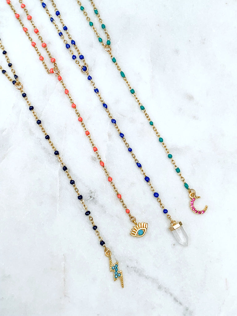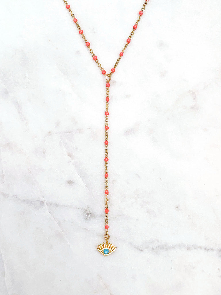 A pop of Coral "Y" Style necklace with a tiny evil eye charm is a favorite!