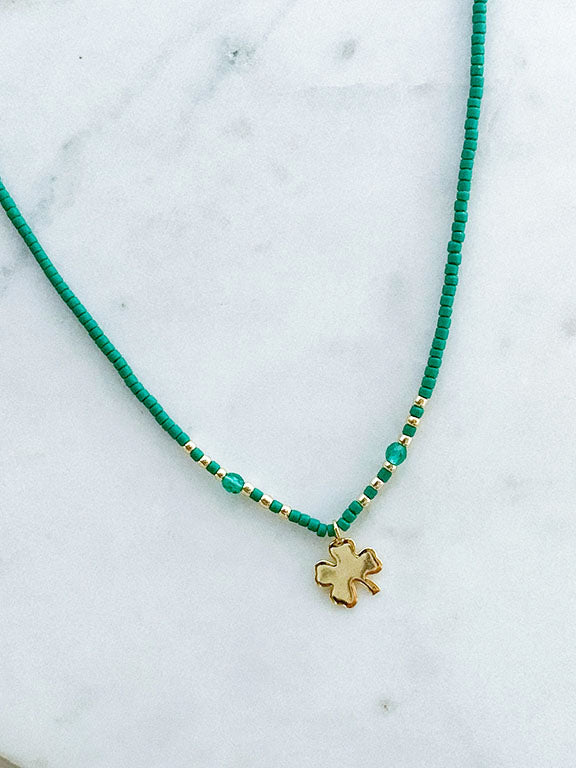 This lucky charm necklace features a gold-plated 4-leaf clover charm and the perfect shade of green Afghan and Czech glass beads.